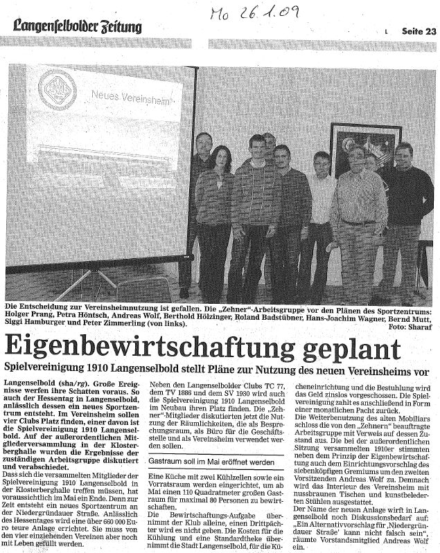 | 29.01.09 | Neues Vereinsheim Pläne für die Nutzung des neuen Vereinsheims von der außerordentlichen Mitgliederversammlung beschlossen